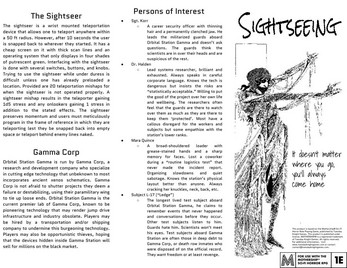 Sightseeing is a sci-fi horror trifold for Mothership®, inspired by the chaotic devices of Heat Signature, the many transporter troubles of Star Trek in all its incarnations, and the existential dread of Stephen King’s The Jaunt. At its center is the Sightseer, a wrist-mounted teleportation device capable of short-range jumps that are followed, inevitably, by a violent snap back to where you started. Tested aboard Orbital Station Gamma, the technology blends cutting-edge corporate R&D with half-understood alien schematics, enforced by paramilitary security and paid for with disposable lives. Players may be saboteurs, thieves, or desperate survivors, navigating corporate doublespeak, labor unrest, and test subjects who remember futures that haven’t happened yet. Every misuse of the Sightseer risks stress and a roll on a d20 table of catastrophic teleportation mishaps: duplicates, temporal displacement, bodily fusion, or worse.